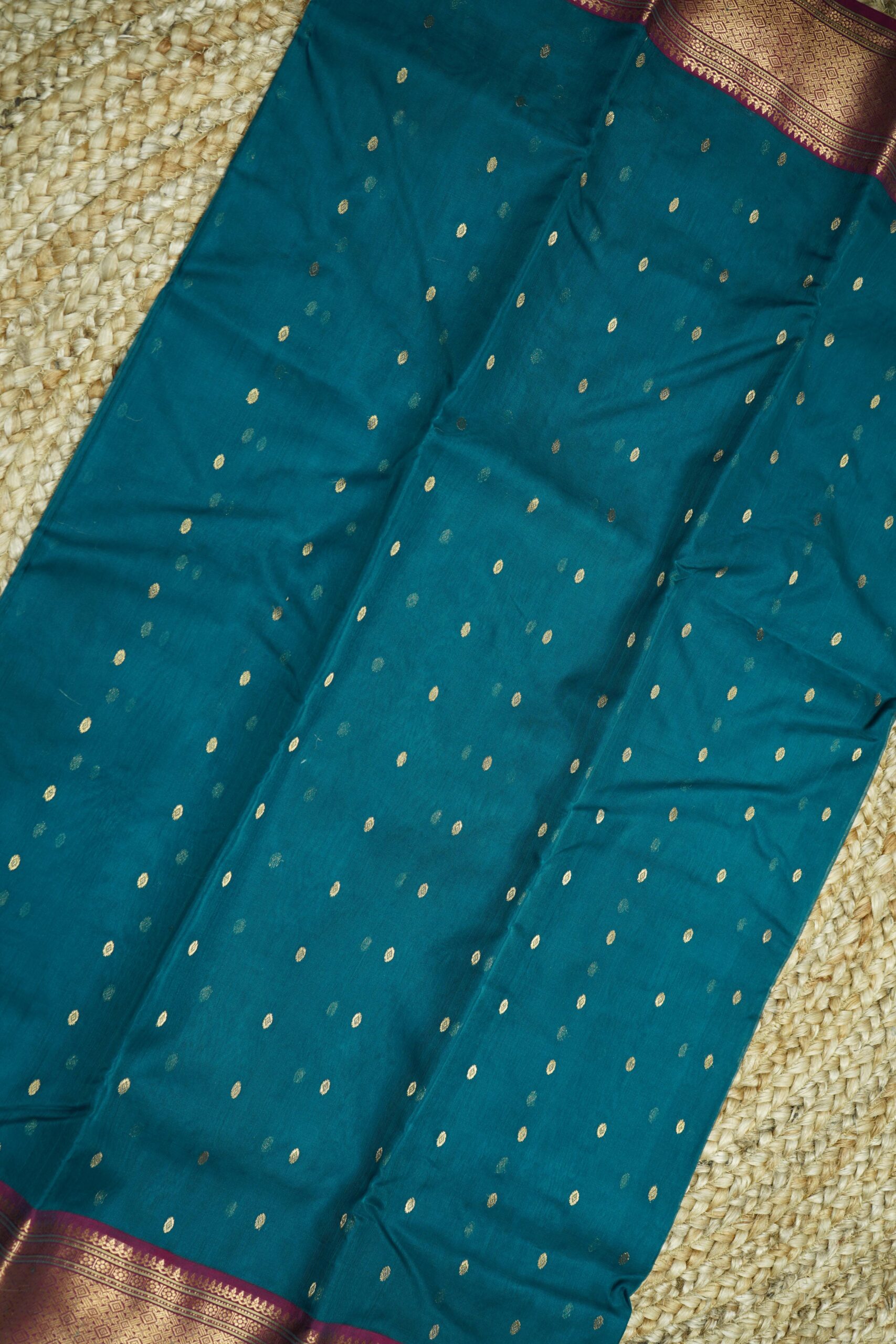 Pair this saree with a gold or dark magenta blouse for a striking contrast, and accessorize with antique gold jewelry or statement pieces for a regal look. Perfect for festivals, family gatherings, or cultural events, this Dark Cyan Chanderi Silk Saree embodies grace and tradition with a contemporary twist.