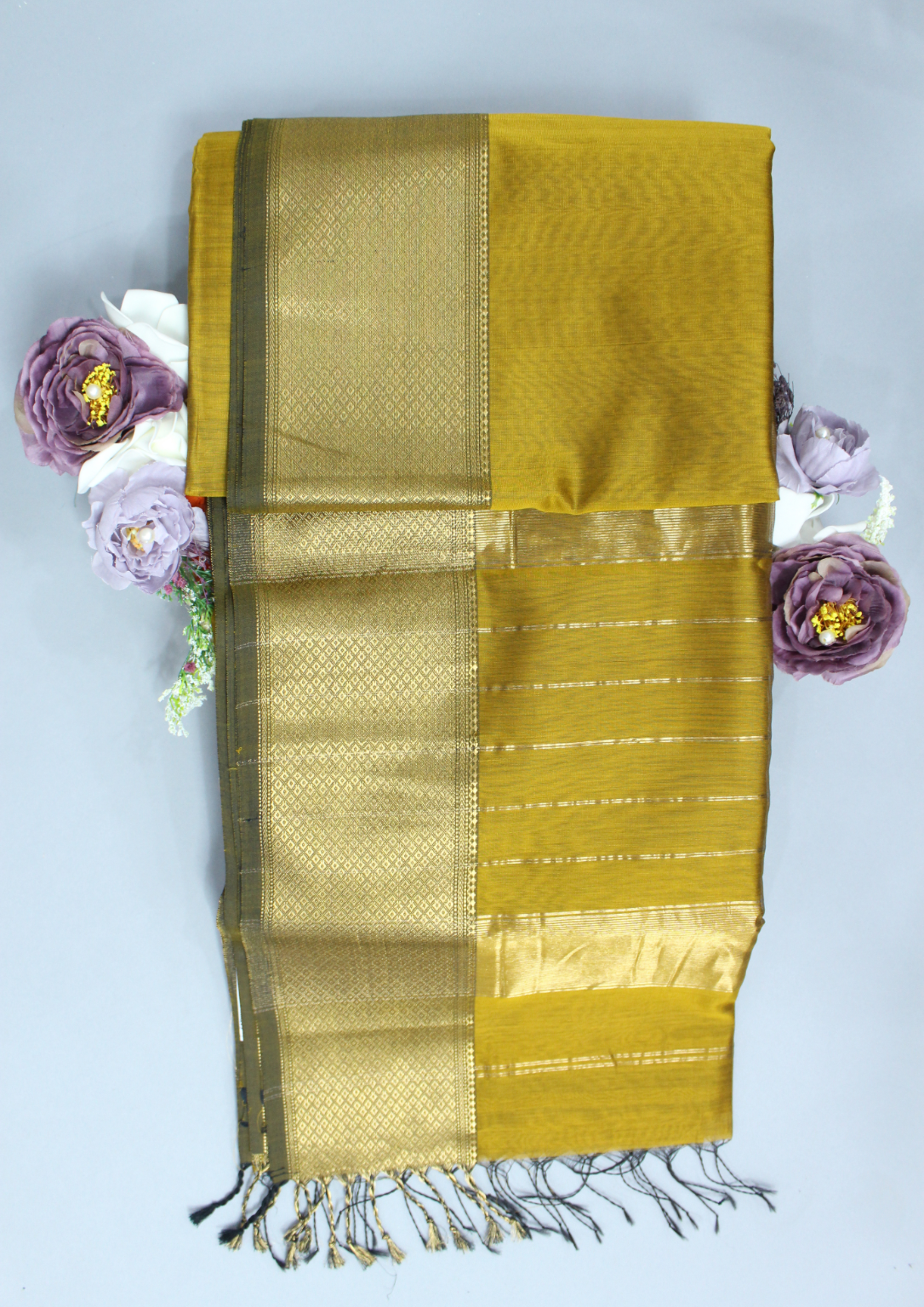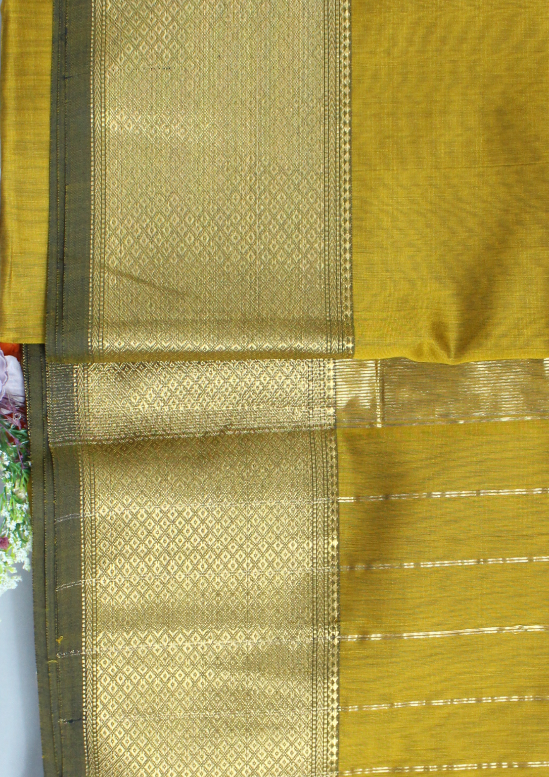 Honey Maheshwari Pure Handloom Silk-Cotton Saree, adorned with graceful Jari-Neer weaving and fine handloom detailing. The warm honey hue and timeless elegance make it a perfect drape for festive occasions and cultural gatherings